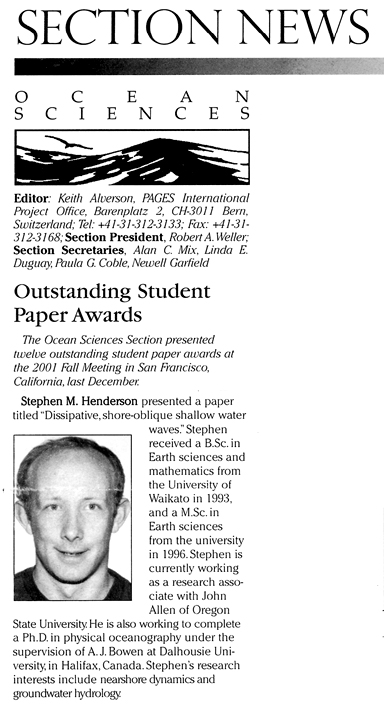 Steve Henderson wins an "Outstanding Student Paper Award" at the 2001 Fall Meeting in San Francisco. EOS, Vol. 83, No. 10, 5 March 2002.