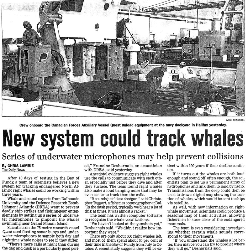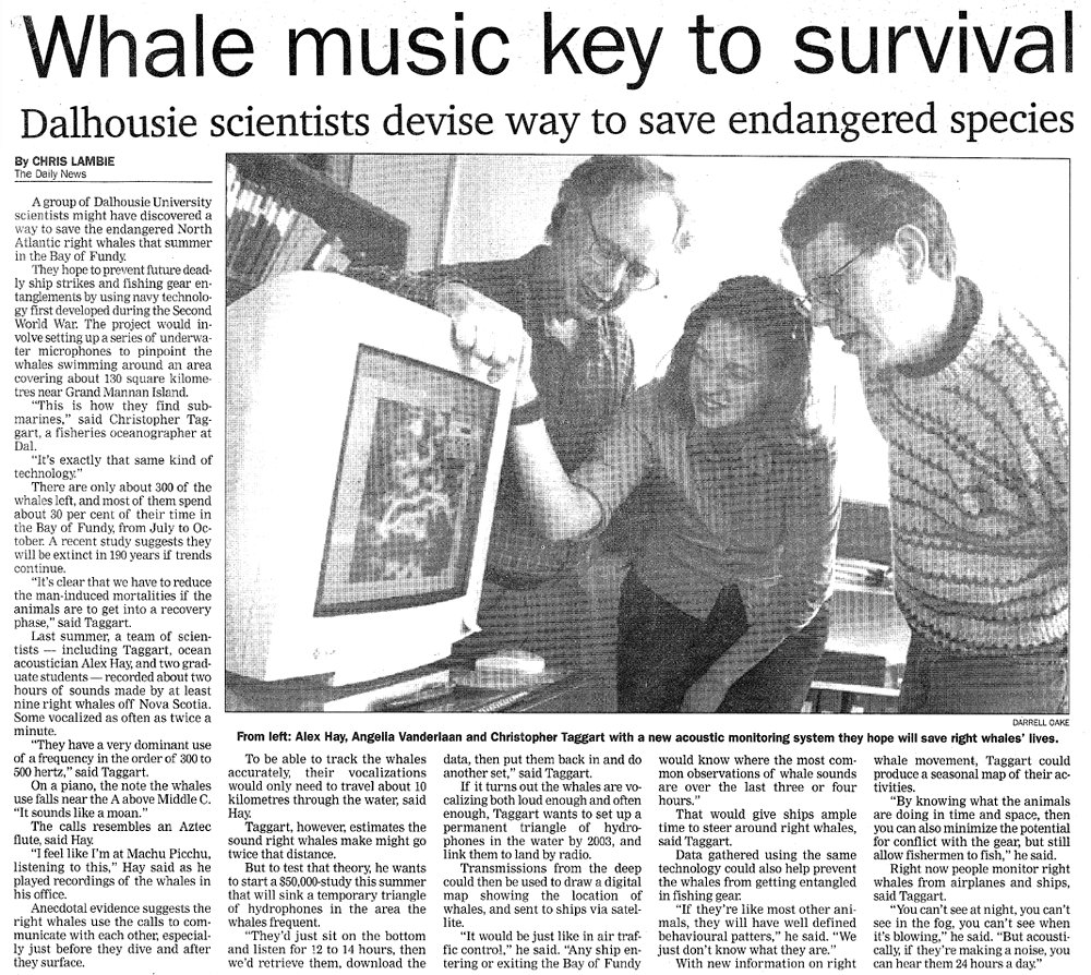 Whale music key to survival: Dalhousie scientists devise way to save endangered species. The Daily News, Spring 2000.
