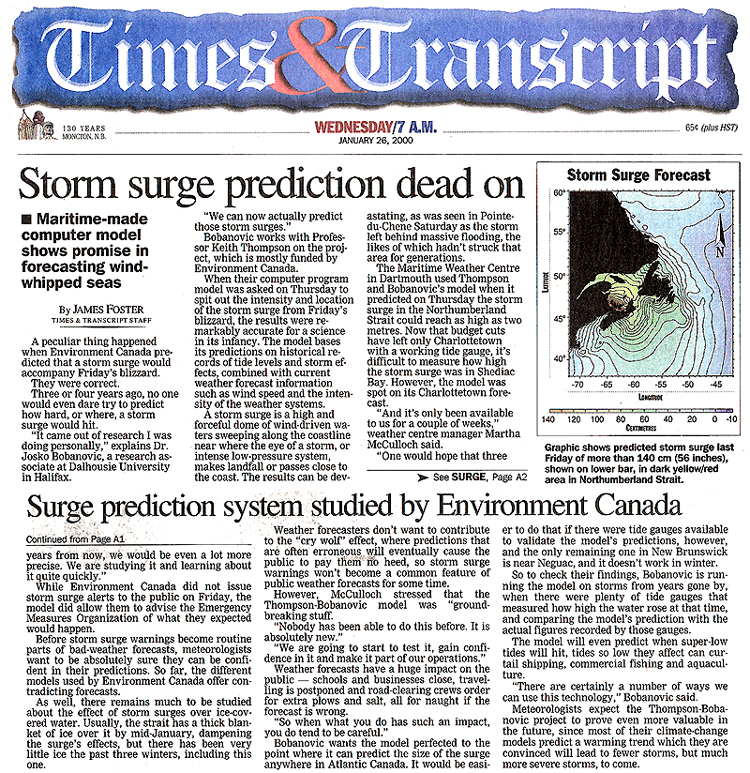 Storm surge prediction dead on. Times & Transcript (Moncton, NB), January 26, 2000